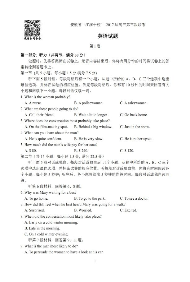 安徽江淮十校2017届高三下学期第三次联考英语试题及答案