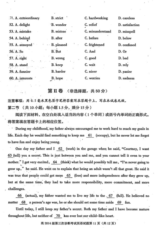 雅安市高中2014级第三次诊断性考试英语试题及答案(11)