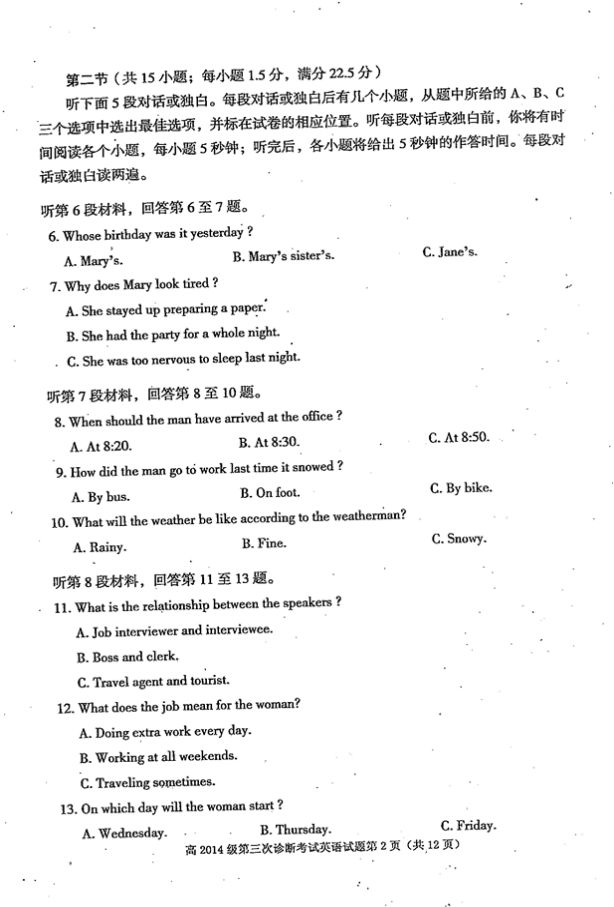 雅安市高中2014级第三次诊断性考试英语试题及答案(2)