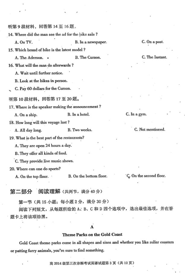 雅安市高中2014级第三次诊断性考试英语试题及答案(3)