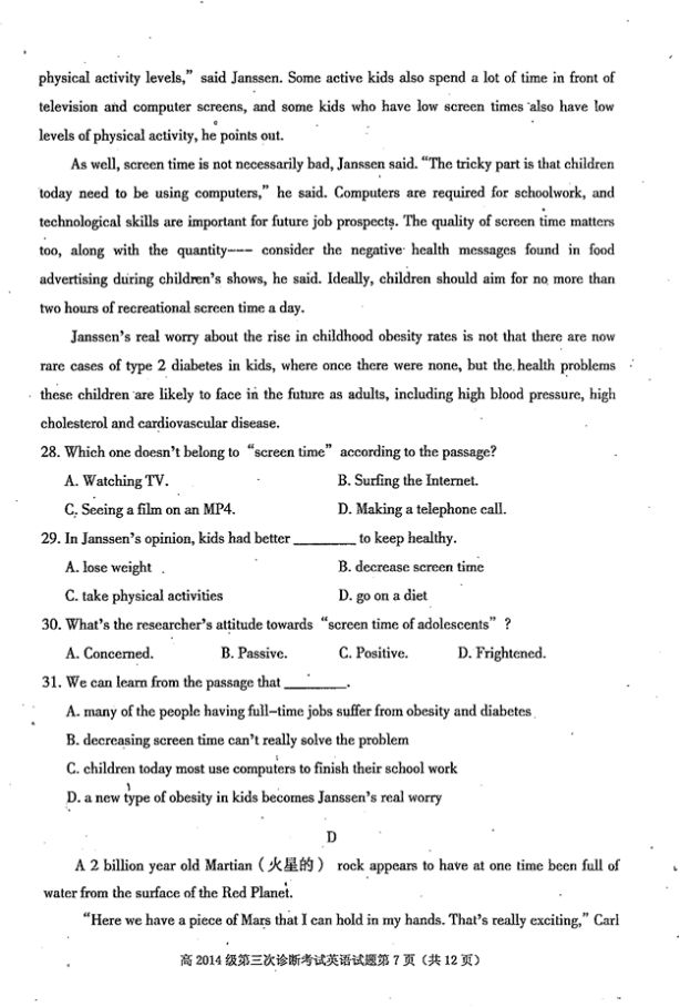 雅安市高中2014级第三次诊断性考试英语试题及答案(7)