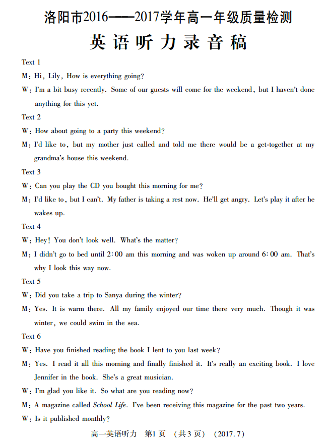 洛阳市2016-2017学年高一年级质量检测英语试题答案(2)