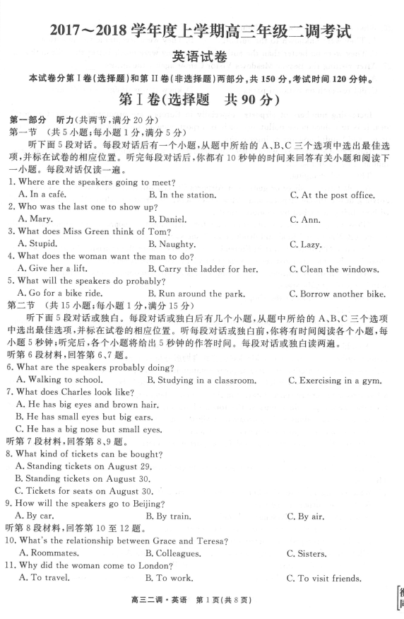 衡水中学2017-2018学年上学期高三二调英语试题及答案