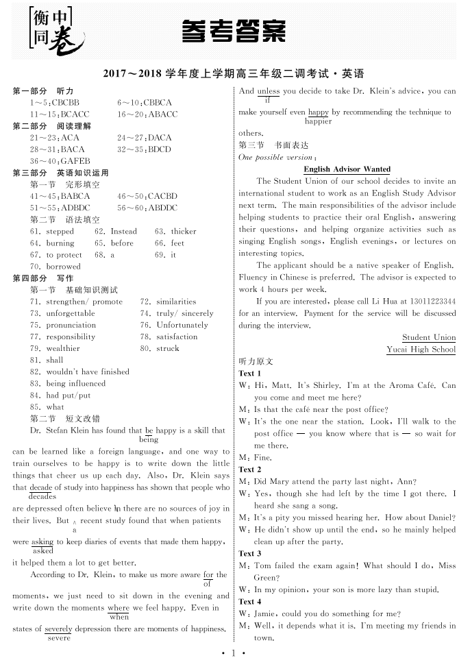 衡水中学2017-2018学年上学期高三二调英语试题及答案(9)