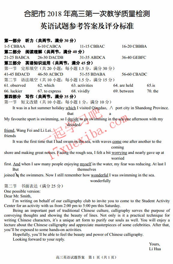 2018年合肥一模英语试题及答案