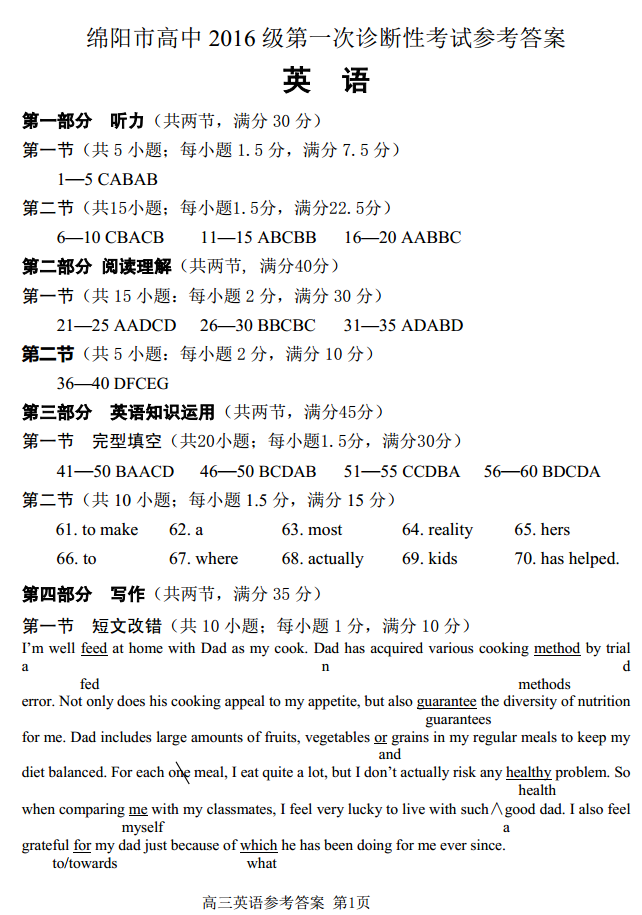2019年绵阳一诊英语试题及答案