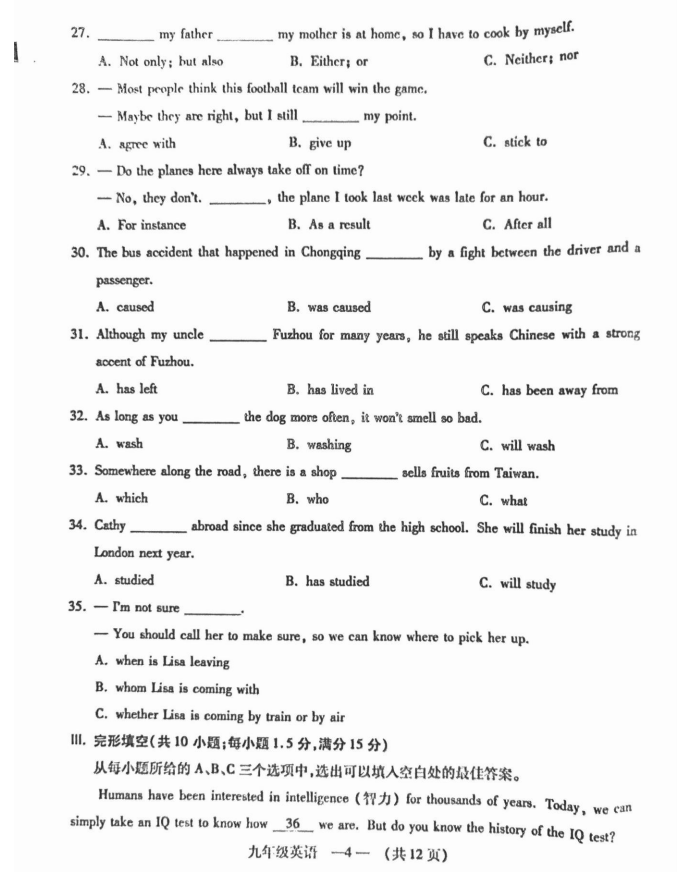 福州市2018-2019学年第一学期九年级期末质量检测英语试题答案(4)