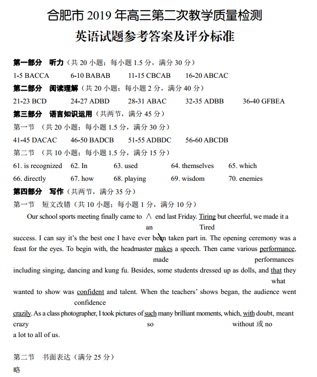 合肥市2019年高三第二次教学质量检测英语试题答案