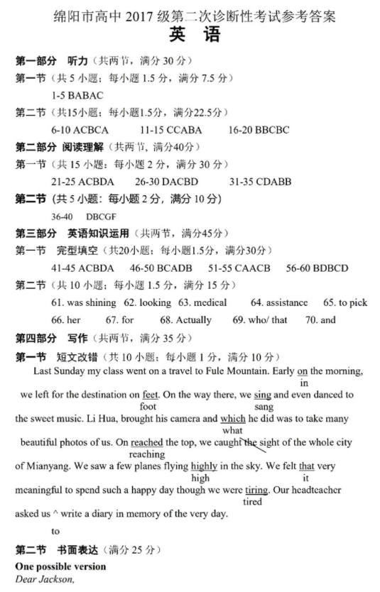 2020年绵阳二诊英语试题及答案