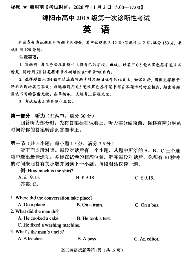2021年绵阳二诊英语试题及答案