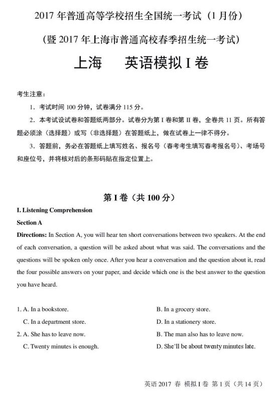 2017上海高等学校招生全国统一考试春季招生英语一试题及答案