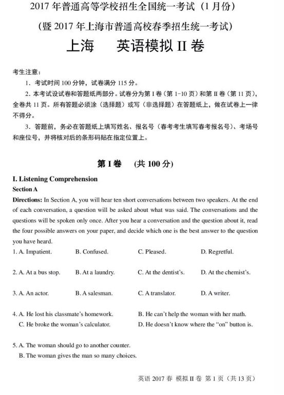 2017上海普通高校春季招生全国统一考试英语二试题及答案