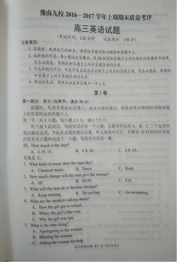 豫南九校2016-2017学年上期期末质量考评高三英语试题及答案