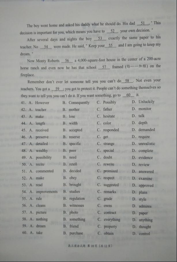 豫南九校2016-2017学年上期期末质量考评高三英语试题及答案(10)