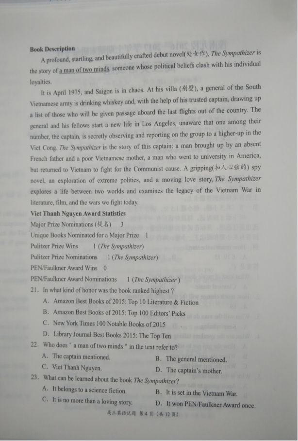豫南九校2016-2017学年上期期末质量考评高三英语试题及答案(4)