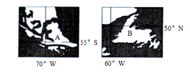 下图为世界两个著名岛屿。A岛纬度较高,气温较低,岛的西部年降水量高达2000mm以上,而东部降水较少,不足500mm。B岛冬冷夏凉,天气多变,7月平均气温10~15℃,东部沿海夏季多雾。根据图文资料完成1~2题。