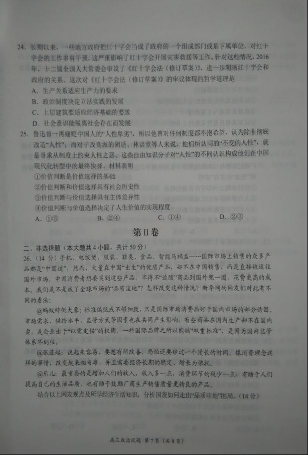 豫南九校2016-2017学年上期期末质量考评高三政治试题及答案(7)