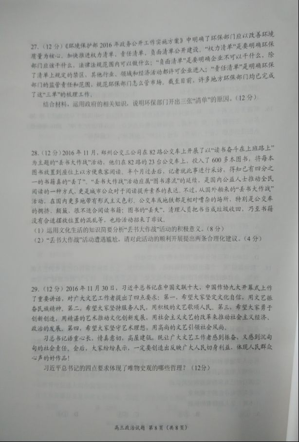 豫南九校2016-2017学年上期期末质量考评高三政治试题及答案(8)